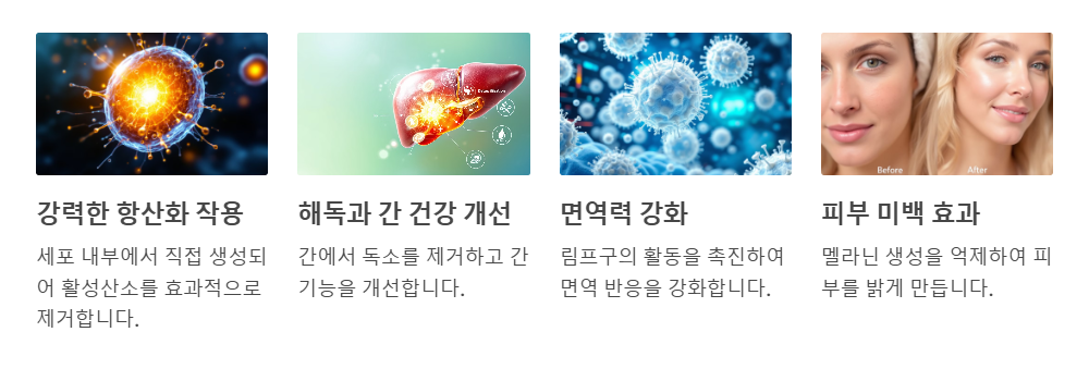 글루타티온은 이러한 기능을 통해 건강과 미용 전반에 걸쳐 다양한 이점을 제공합니다.